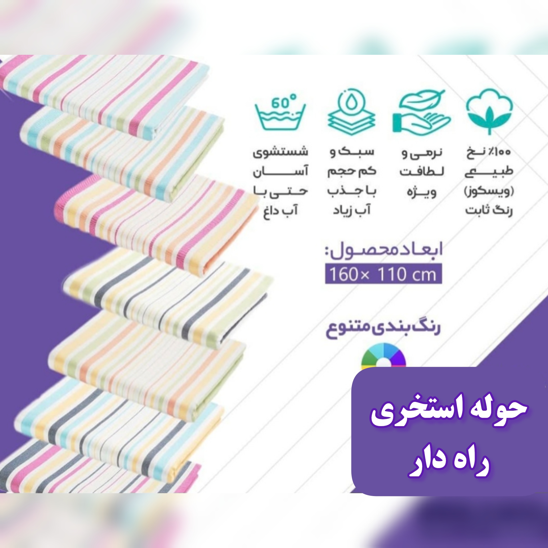 تا حالا برای شما پیش آمده که بخواهید برای مسافرت ، چمدان سبک و کم حجم رو    انتخاب کنید اما به دلیل بعضی ملزومات سفر مثل حوله های حجیم و … امکان    پذیر نبوده؟ یا برای رفتن به استخر به یک حوله‌ی سبک و کم حجم نیاز داشته    باشید؟ یا حتی مهتر از این موارد در منزل از حوله‌ نخی ای استفاده کنید که    جذب آب بالایی داشته باشد و سریع خشک بشود ، سبک ، کم حجم ، ضد حساسیت ،    لطیف و زیبا باشد ؟ استفاده از %۱۰۰ الیاف طبیعی ویسکوز دارای لطافت و   نرمی ویژه و قدرت جذب بالای آب بوده و این امر باعث رضایت مصرف کننده و   ایجاد حس خوشایندی در هنگام مصرف می شود ؛ همچنین محصول پیش روی شما دارای   رنگ %۱۰۰ ثابت (رنگ راکتیو) می باشد که چهره ای زیبا به محصول بخشیده  است.